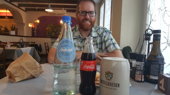 And of course, a German restaurant requires beer. Paul had a liter of some dark beer. And I had a Coke. Because that is all they serve here, soda-wise. We also ordered a bottle of water, which came with the tiniest glasses. Like, shot glasses of water. Of course, as Paul becomes more stressed out at work, his ratio of beer to water adjusts accordingly.