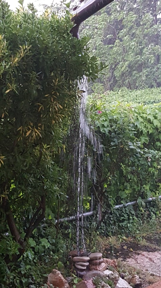 This AirBnB is big into sustainability and conservation. They have a solar panel system for the hot water, a rain barrel system for landscaping, underground heating around the parking lot for winter safety, and are very into recycling. The roof drainage gutter below is kind of cool, rather than just spewing out of the tube, it has chains to the ground. So not only does it sort of help the runoff to spread better, it is an interesting landscape look. There are a lot of succulents incorporated into the landscaping, as well.